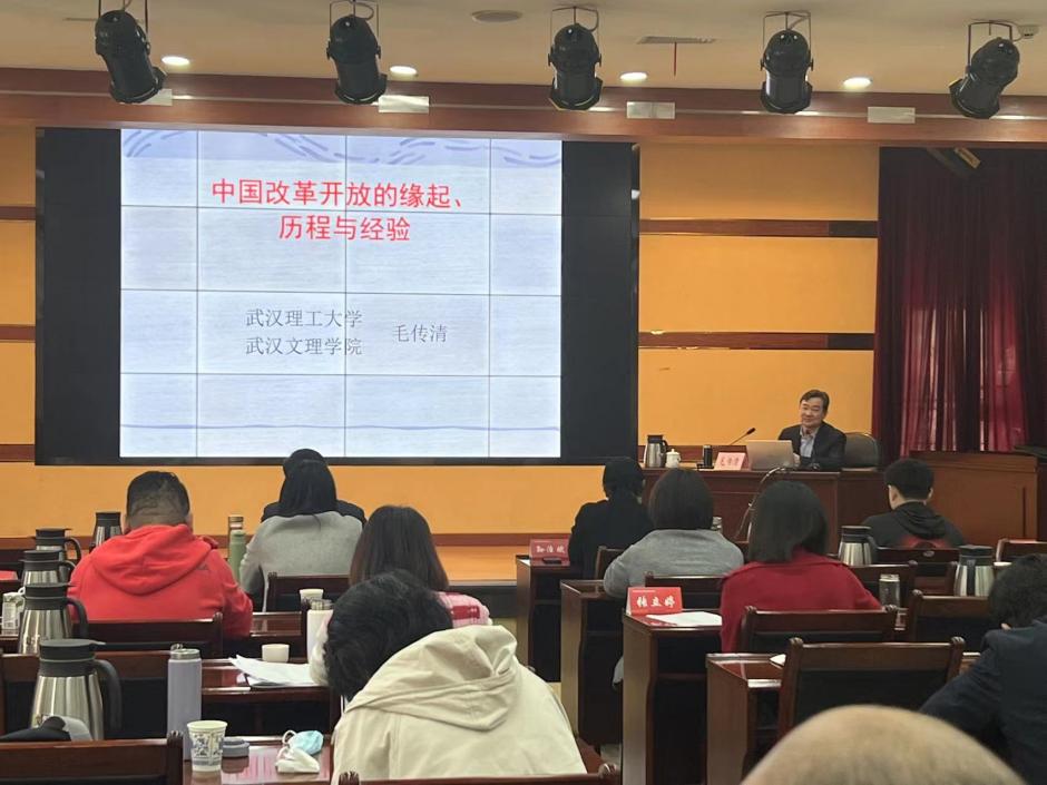 2023年3月10 日上午,我校Beat365亚洲版官网入口院长、武汉理工大学毛传清教授应邀为2023年全省民主党派中青年骨干培训班授课。毛院长以“中国改革开放的缘起、历程与经验”为题,深入讲述了改革开放的历史前提和蕴酿探索、发展历程和基本特征、巨大成就和根本原因、伟大意义和基本经验,毛院长的讲课深入浅出,生动活泼,理论联系实际,材料数据丰富,既有思想高度和理论深度,又有很强的针对性和感染力,受到民主党派中青年骨干培训班学员的欢迎和承办方湖北省社会主义学院领导的高度评价。